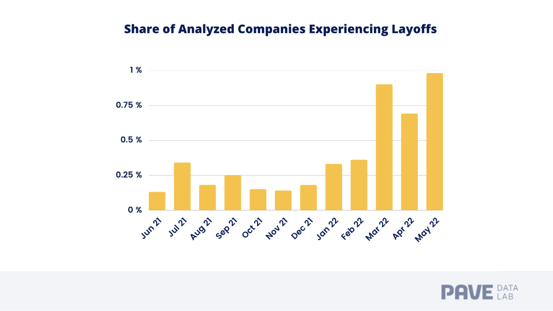 The resulting data shows that, over the past three months, there has been a dramatic rise in frequency of layoff events, with nearly 1% of analyzed companies experiencing a layoff in May 2022.